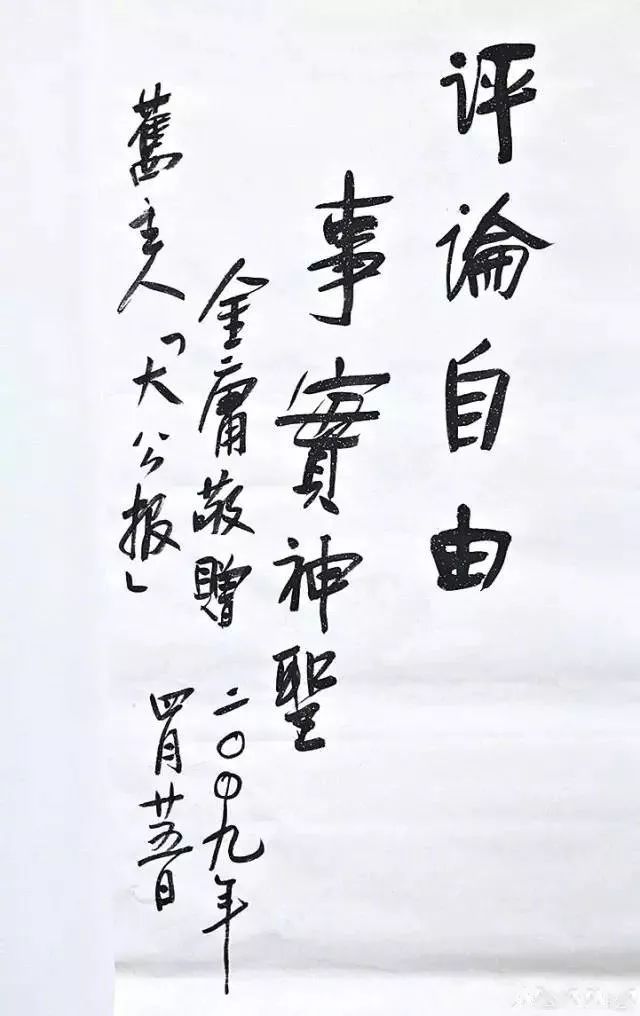 2009年4月下旬,金庸相隔52年重回《大公报》,他参观了编辑部、电脑部,并与报社负责人及年轻记者、编辑进行了座谈。金庸亲切地与报社的“金庸迷”签名、合照,勉励新人,还应邀即席挥毫,提笔写下“评论自由 事实神圣”,并在下款写上“敬赠旧主人大公报”。