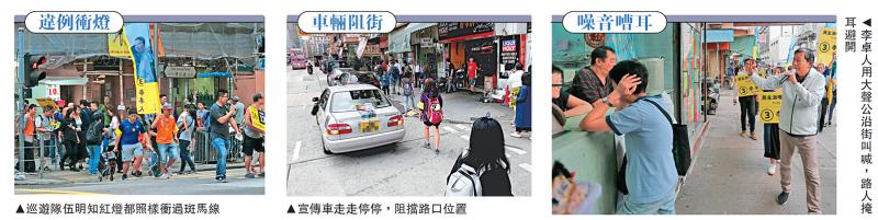 李卓人数以百计、来势汹汹的助选团成员,昨日在区内四处游走期间,不时冲红灯、站出行人路展示旗帜和宣传牌、阻塞行人路、近距离以扩音器滋扰市民。而由于巡游队伍不时因李卓人停步宣传而原地等候,有过马路的市民在红灯亮起后,仍被阻挡而无法走上行人路。