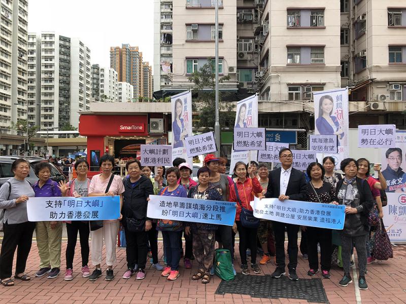 团体“明日大屿愿景联盟”逾二十位成员昨日在九龙黄埔集会,呼吁来往街坊积极关注最新施政报告中重磅推出的“明日大屿愿景”,为香港土地开发、市民安居乐业、全港长远发展贡献力量。