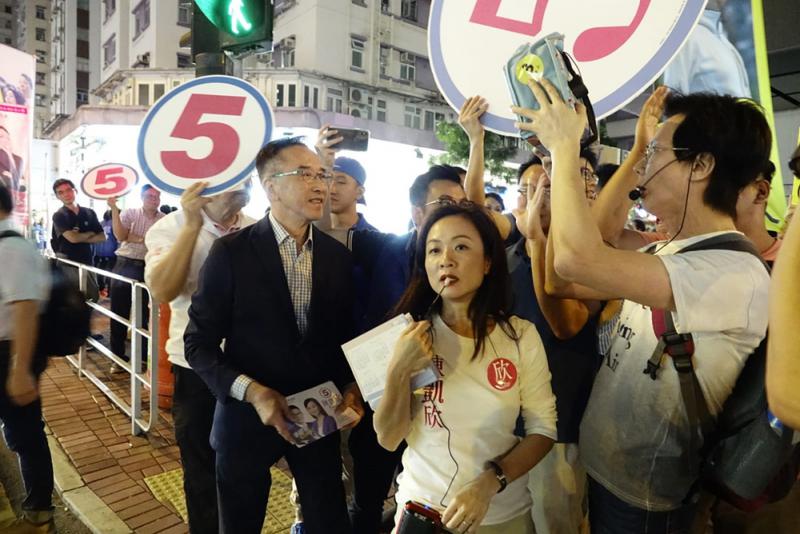 图:陈凯欣(中)与田北俊(左)等支持者在黄埔进行街站宣传活动,遭到李卓人助选团(右)的衝击