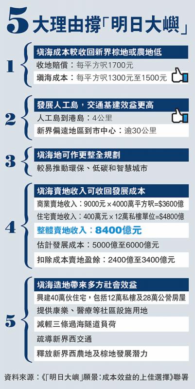 学者联署提出五大理据,力证“明日大屿”物有所值。学者估算,整个计划涉及卖地收入达8400亿元,扣除初步估算的五、六千亿发展成本,卖地不但可以收回发展成本,更有盈余二、三千亿,若计及计划新增34万个职位衍生的税收及经济收益,“财政收入肯定十分可观”。