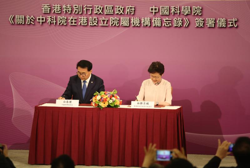 行政长官林郑月娥和中科院院长白春礼昨日在香港礼宾府,签署《关於中国科学院在香港设立院属机构的备忘录》。《备忘录》确立中科院将在香港设立院属机构,包括内地两间研究所将落户香港科学园等。林郑月娥透露,院属机构将成为粤港澳大湾区建设国际科技创新中心的“一大亮点”。白春礼表示,生物科技和人工智能是中科院的优势所在,在港设立院属机构有利支撑香港大力发展创科。