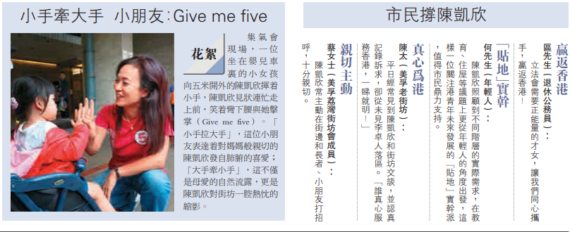 陈凯欣表示,自己将尽力为基层解困,为中产改革,助年轻人成就梦想,让长者重拾尊严。事实上,自宣布参选以来,陈凯欣短期内身体力行,迅速丰富地区工作经验,令不少市民对这位似有无穷能量的妈妈刮目相看。
