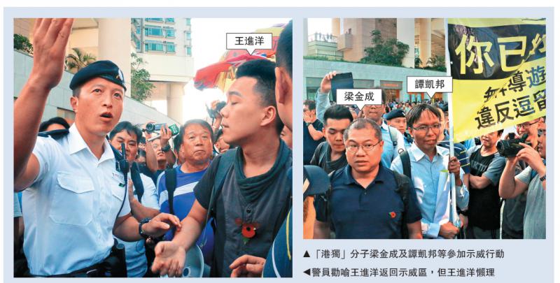 乱港派唯恐东涌不乱,昨趁假日大量旅客经港珠澳桥来港,发起所谓“光复东涌”、“举报黑工”煽动针对旅客的示威行动,行动主要成员全是“港独”分子,发起人“独青”王进洋,联同“学独联”的陈家驹、鼓吹“港独”和“台独”的新民主同盟荃湾区议员谭凯邦,以及北区水货客关注组召集人梁金成等约十多人,手持横额走到东荟城对出空地,疯狂滋扰游客,不理警方劝喻,拒绝返回预设示威区,一班乱港分子又借机大做“乱港骚”。/大公报记者周庆邦(文/图)、黄洋港(图)