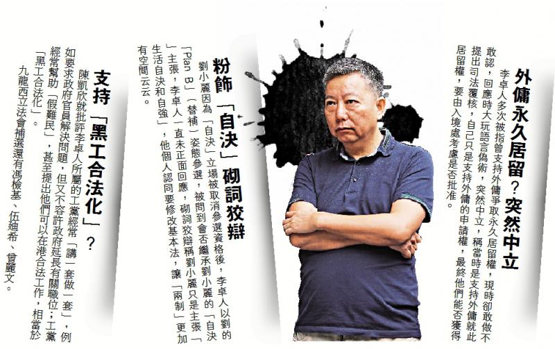 九龙西立法会补选周日(25日)举行,五位候选人近日连续出席多场选举论坛,但李卓人对是否支持“自决”、支持外佣居港权等议题闪缩回避、砌词狡辩。陈凯欣昨日在NOW新闻选举论坛上质疑李卓人所属的工党争取难民可在香港合法工作,等同“黑工合法化”。