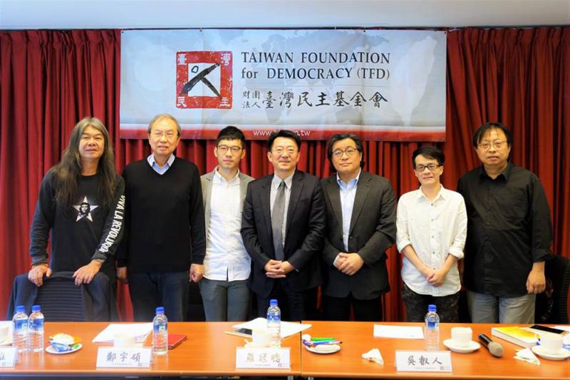 图:梁国雄(左一)、郑宇硕(左二)、罗冠聪(左三)在“台独”分子曾建元(右一)的陪同下,出席台湾民主基金会座谈会