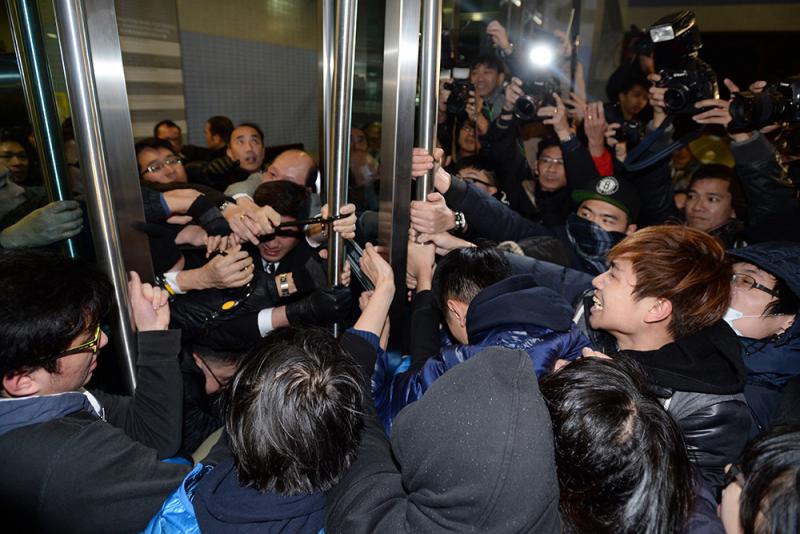 图:反对派煽动校园政治,令学校沦为政治宣泄的场所,导致人才不断外流,图为暴力学生衝击港大校委会