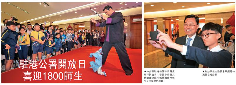 昨天的开放日活动包括新中国外交历程图片展、中国非物质文化遗产提线木偶戏演示,中华美食“川北凉粉”及厨艺演示、领事保护知识话你知、中国明清文物展等十多项。香港教育大学内地硕士生杨同学说,来港后更关注外交事务,“在图片展看到了许多中国人在外国遇到麻烦,以及了解到中国大使馆帮忙解围的事”。他认为今后无论是内地人还是香港人,“拿着中国护照出去,都像是揣着个护身符”。