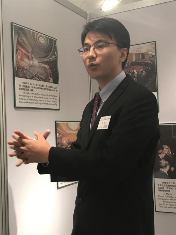“这是香港回归时的升旗仪式,当时中英双方单为这张图就开了12次会议,商讨谁的国旗先升上去,最终商定中方的国旗先升上去。”李勇指着展览内其中一幅图片,绘声绘色地跟访客解说。他说,这次开放日主要是年轻人来,一开始较担心学生听到历史讲解便感到无聊,便索性抛开展板上的文字,运用自身所知加上翻阅资料准备一个个故事,再结合图片告诉访客。