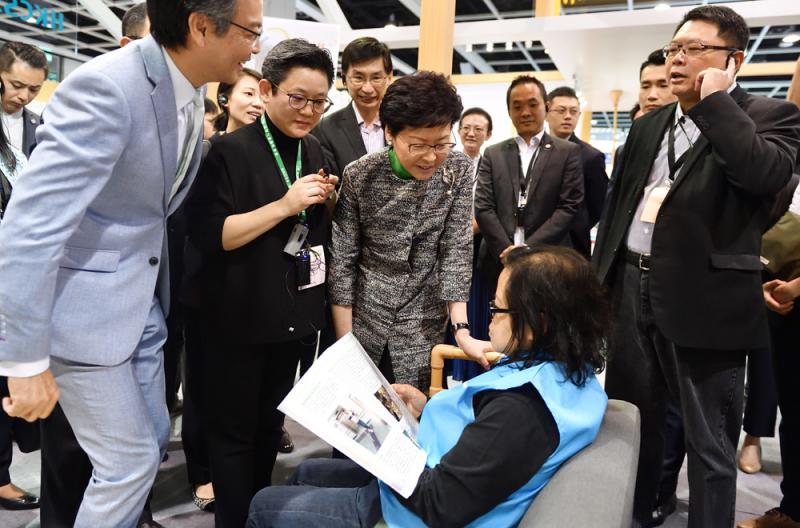 图:行政长官林郑月娥出席伤健共融高峰会后,参观展示照顾长者或残疾人士产品的摊位