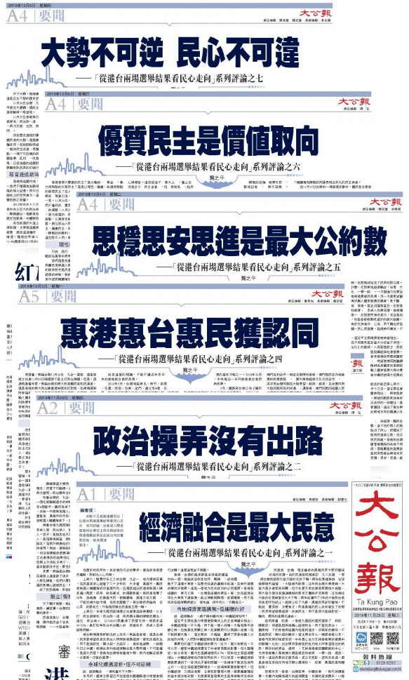 11月28日,也即香港和台湾两场选举结束之后,香港各界都在讨论并分析选举结果的意义,在此关键节点上,《大公报》在头版头条刊出以“龚之平”为笔名的“从港台两场选举结果看民心走向系列评论”;其后六篇,分别在11月29日、30日,以及12月3日、4日、5日、6日,在《大公报》要闻版的A2和A4版刊出。