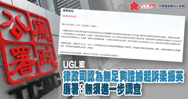 廉政公署已就有关香港特别行政区前行政长官梁振英及立法会议员周浩鼎的涉嫌贪污及公职人员行为失当指控作出全面调查。有关指控源于(一)梁振英与UGL Limited(UGL)签订协议,及在他担任行政长官期间接受该公司的款项;及(二)梁振英及周浩鼎涉嫌介入“调查梁振英先生与澳洲企业UGL Limited所订协议的事宜专责委员会”(“专责委员会”)的调查。