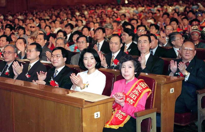 图:伍淑清(前排右)早年已到内地发展,图为她1999年出席在北京人民大会堂举行的中央民族工作会议开幕式暨国务院第三次全国民族团结进步表彰大会