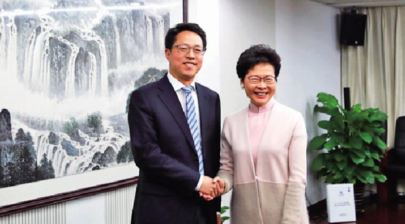 图:林郑月娥昨日与张晓明举行工作会晤,两人亲切握手