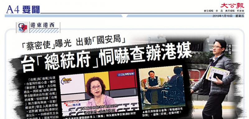 《大公报》日前踢爆“港独”组织学生动源赴台勾结“台独”分子,与“蔡密使”(所谓《自由时报》记者)苏永耀密会,台湾当局如临大敌、恫吓要出动“国安局”查办港媒,有媒体昨日引述台湾官员称,未来大公文汇申请赴台采访,至少三年内不会准许。过去常把捍卫言论自由挂在嘴边的民进党,如今公然打压新闻自由,可谓赤膊上阵了。