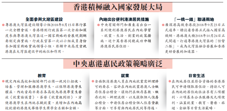 港澳进一步融入国家发展大局更是习主席最关切的问题。去年是改革开放40周年,11月12日,习近平在人民大会堂会见了香港澳门各界庆祝国家改革开放40周年访问团,充分肯定港澳同胞在国家改革开放进程中的作用和贡献。习近平强调,在新时代国家改革开放进程中,香港、澳门仍然具有特殊地位和独特优势,仍然可以发挥不可替代的作用。习近平亦对港澳提出四点希望:一是更加积极主动助力国家全面开放;二是更加积极主动融入国家发展大局;三是更加积极主动参与国家治理实践;四是更加积极主动促进国际人文交流。