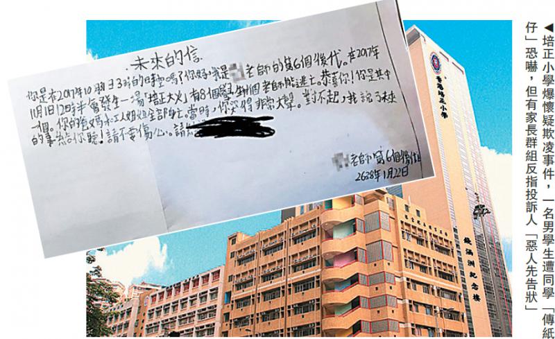 传统名校培正小学怀疑校园欺凌,事件网上广泛流传后爆出罗生门。有家长发出一则帖文,声称培正一名小四男学生遭同学多次“传纸仔”恐吓,内容包括“你的爸妈和工人姐姐全部身亡”,并遭对方两度袭击,据称校方拒绝受理,该名学生其后疑因精神崩溃被迫转校。不过,培正家长群组及后道出另一版本,反指被欺凌的小四生“出手打人”,批评家长“恶人先告状”。教育局已收到投诉并会跟进,发言人强调对校园欺凌“零容忍”。/大公报记者 赵凯莹