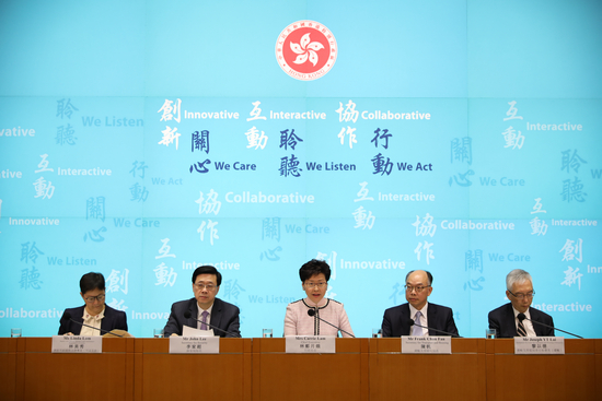 林郑月娥(中)表示,现时修例出于同情及怜悯心(全媒体记者李湃丰摄)