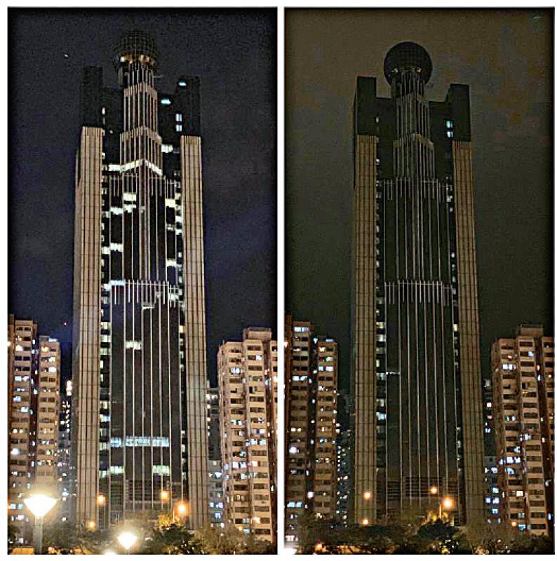 图:中联办响应“地球一小时”环保活动,办公楼熄灯前(图左)和熄灯后(图右)形成强列对比