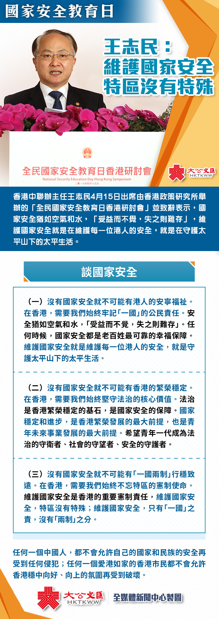 由香港政策研究所举办的“全民国家安全教育日香港研讨会”今日(15日)举行。香港中联办主任王志民致辞时表示,香港的安全是国家安全的一部分,维护国家安全是“一国两制”宪制使命,在维护国家安全一事上,特区没有特殊,只有“一国”之责,没有“两制”之分。