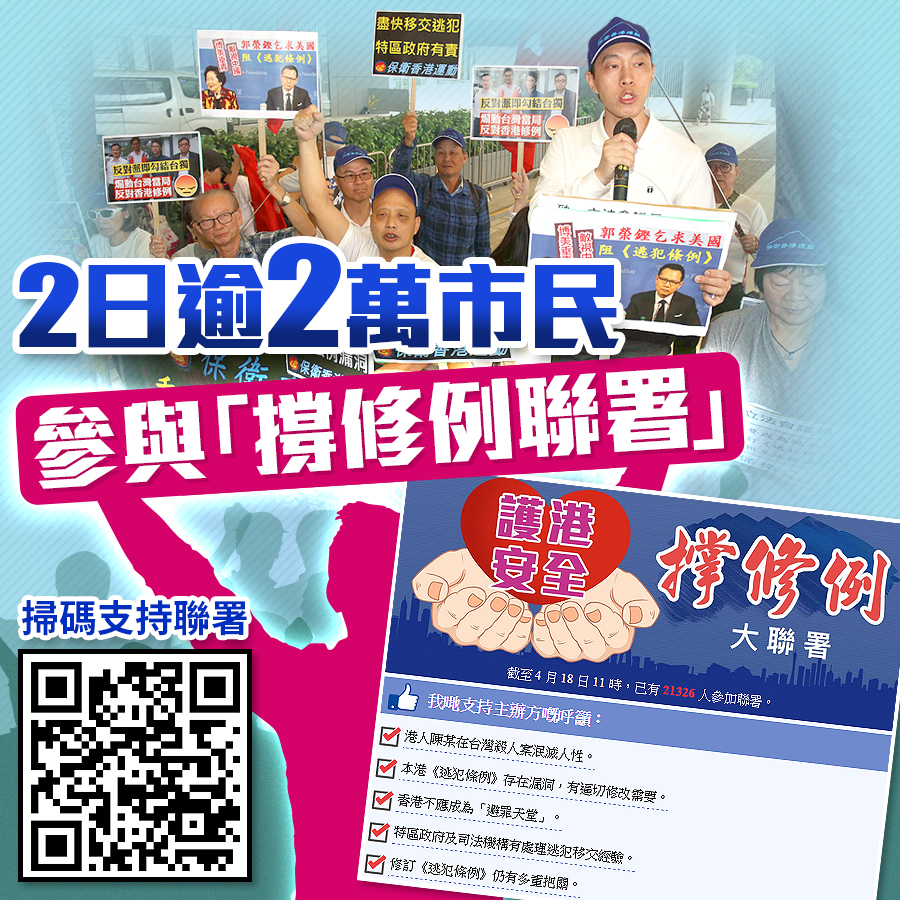 大公文汇全媒体报道:由香港工商、法律、科技、基层等多个界别人士于4月16日发起的“护港安全撑修例大联署”活动,得到了香港市民的大力支持。截至今日(18日)上午11时,已经有21326人参与联署活动。