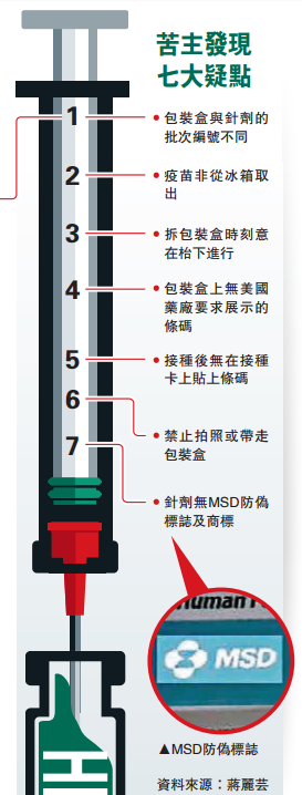 另外,部分苦主更发现不少疑点,包括有接种的疫苗包装盒与针剂的批次编号不同、九价HPV疫苗并非从冰箱取出,包装盒上无美国药厂要求展示的条码(Barcode),接种后无在接种卡上贴上条码,疫苗针剂亦无MSD防伪标志及商标等等,均与美国默沙东药厂要求规定不同。事后她们自行联络美国药厂告知有关情况,药厂回覆指接种的疫苗并非药厂正货。