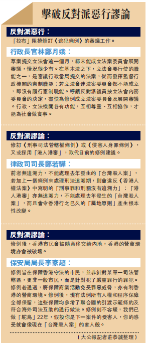 保安局为处理“台湾杀人案”及堵塞存在多年的法律漏洞,建议修订《逃犯条例》,但反对派却借题发挥,搬出“人人都可能是逃犯”的谬论,大肆攻击内地司法制度。基本法委员会副主任谭惠珠接受大公报专访时表示,将法律问题变成政治问题,再将矛头指向内地,已成为反对派的“标准动作”,所谓“送中”则更加是“恐吓人心”之举。行政会议成员、资深大律师汤家骅认为,坊间提出的修例意见几乎都是建基于危言耸听的基础上,偏离了一般的法律原则和移交疑犯的基本方向,政府认为不可取绝对合理。