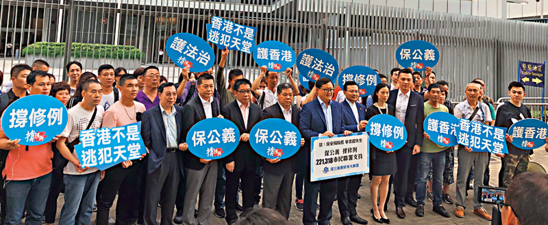 “保公义,撑修例!护香港,守法治!”本港广泛民意支持修订《逃犯条例》。来自工商、专业、青年、基层等界别的人士昨日宣布成立“保公义撑修例大联盟”(“大联盟”),指出短短数周内已有22万市民网上联署支持修例,民意如山!大联盟强调,尽快通过修例以彰显公义及堵塞法律漏洞,是广大市民的普遍心声,香港不能成为逃犯的“天堂”。对于反对派千方百计阻挠修例,今日更拟占领议会,大联盟批评反对派此举等同帮助罪犯逃避罪责,纵容杀人犯在香港自由活动,促请其顺应民意,勿做罪犯帮凶。