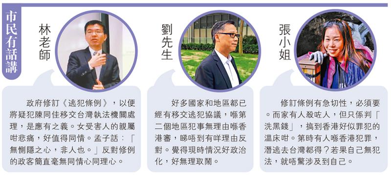 另外,多名出席记者会的嘉宾亦纷纷支持修例。香港法学交流基金会主席马恩国表示内地法治已大有进步。港区妇联代表联谊会会长彭徐美云表示,每一名母亲都希望孩子能够在一个安全的环境下成长,现在罪犯可能随时出现在身边,“我们很担心,不知道孩子会点?家人会点?所以为了家人的安全,我真的很希望能够尽快修例。”香港政协青年联会主席谭镇国指出,不能明知有法律漏洞而不加填补,希望政府尽快修例,令香港青年能够在一个安全的环境中成长。