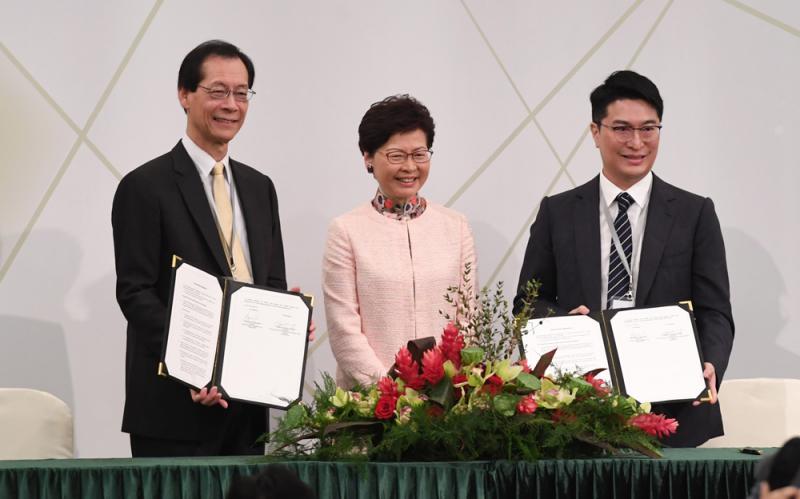 图:行政长官林郑月娥见证香港桂冠论坛委员会主席唐伟章(左)与李兆基基金董事李家诚(右)签订赞助协议/大公报记者林良坚摄