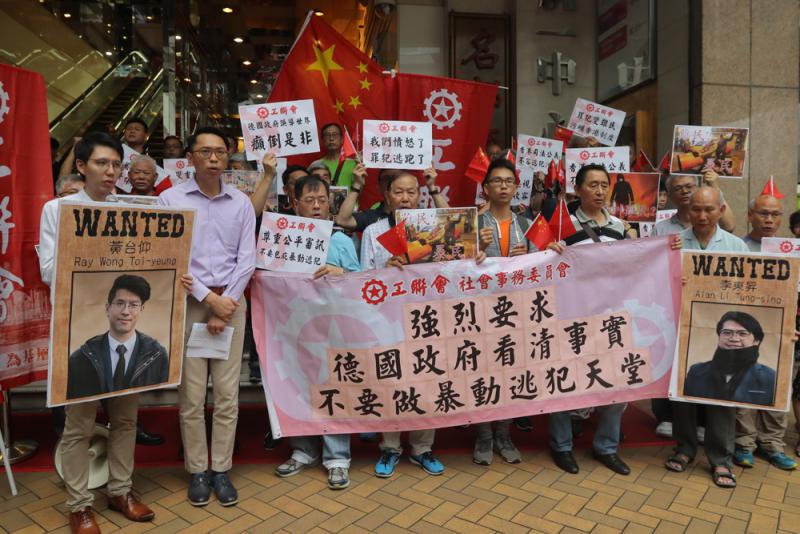 工联会立法会议员陆颂雄及工联会约二十人昨日到德国驻港总领事馆外示威,并向德国驻港总领事馆职员递交请愿信。他们批评德国政府向黄台仰及李东升提供难民庇护,是变相鼓吹暴力,令违法的人不需要承担刑事责任,认为即使他们回港,都可以得到公开公正的审讯,要求德国政府重新检视两人的难民身份。