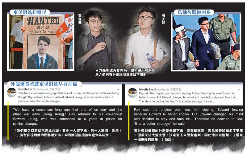 图:外媒引述黄台仰称,他和梁天琦较早之前已有计划谁潜逃谁留下服刑