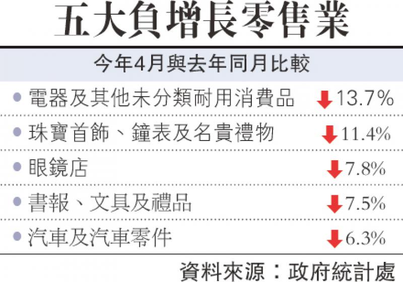 政府统计处昨日公布,四月份零售业总销货价值按年下跌4.5%,首四个月合计下跌2.0%,扣除价格变动后,四月份零售业总销货价值按年跌5.0%,首四个月合计下跌2.3%。