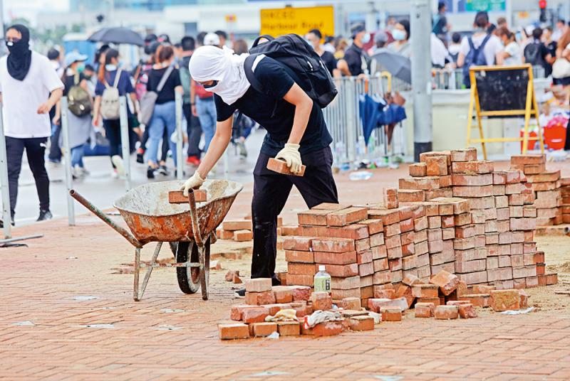 反对派日前在网上号召群众包围立法会,前晚已有大批人通宵围在立法会外。昨早七时,一批戴口罩的示威者冲出马路,占据添美道,及后进一步分占夏慤道及龙和道。他们将铁马布成三角阵,以索带绑紧,堵塞道路,又四处撬起地砖作武器及加固防线,当有记者在旁拍摄时即大声喝止及强抢手机删片。与此同时,大批物资陆续送抵,一切早有部署。