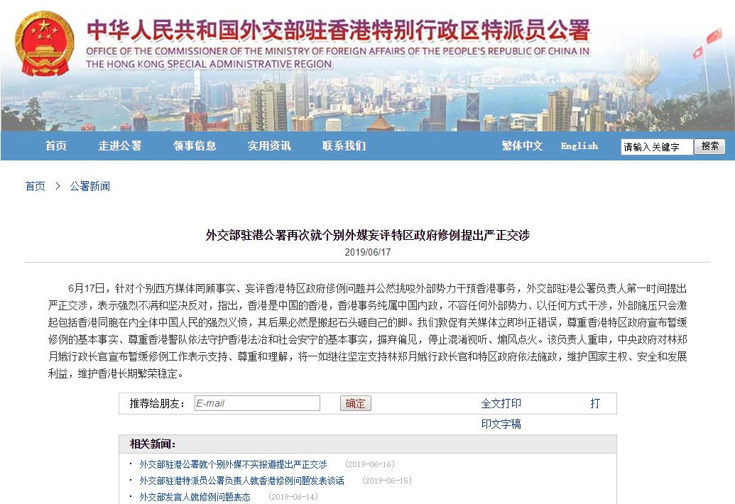外交部驻港公署负责人指出,香港是中国的香港,香港事务纯属中国内政,不容任何外部势力、以任何方式干涉,外部施压只会激起包括香港同胞在内全体中国人民的强烈义愤,其后果必然是搬起石头砸自己的脚。该负责人敦促有关媒体立即纠正错误,尊重香港特区政府宣布暂缓修例的基本事实、尊重香港警队依法守护香港法治和社会安宁的基本事实,摒弃偏见,停止混淆视听、煽风点火。