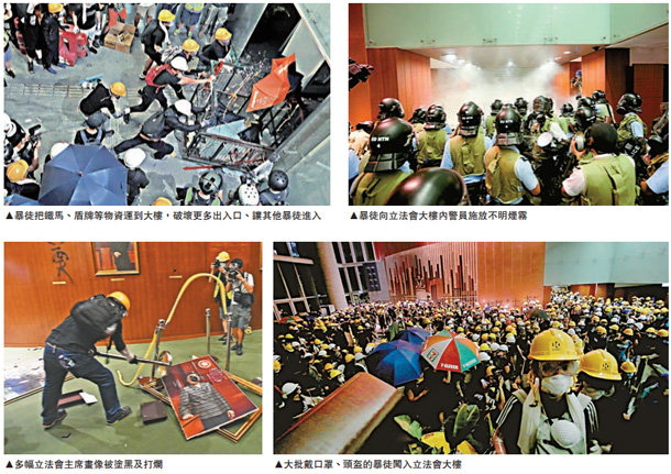 到晚上,大批暴徒从撬起的铁闸缝隙,向立法会大楼内施放不明烟雾、逼退警员,之后暴徒撬开铁闸,蜂拥闯入立法会大楼,大肆破坏。电子荧幕、投影机、天花、灯、警钟、闭路电视、影印机、储物柜等,都成为攻击目标,图书馆玻璃门亦被暴徒用铁质推车撞至粉碎。暴徒亦把铁马、盾牌等物资运入大楼,又取走大楼内的灭火筒到处敲打,并陆续破坏更多出入口、让其他暴徒进入。
