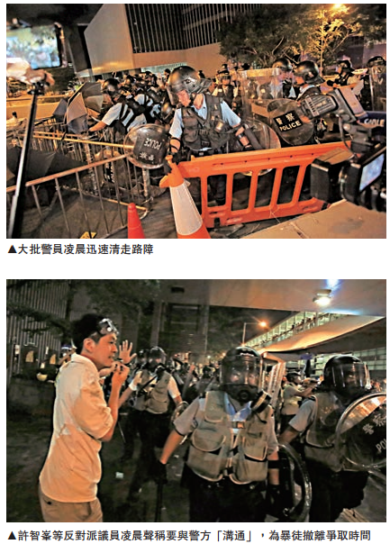 警方约今日凌晨12时起,从湾仔警察总部出动,向立法会方向推进。其间杨岳桥、谭文豪、许智峯等反对派立法会议员企图阻挠、俨如暴徒“保护伞”;民主党邝俊宇用扩音器声称要与警方沟通,苹果直播记者说,此举是为暴徒撤离争取时间。