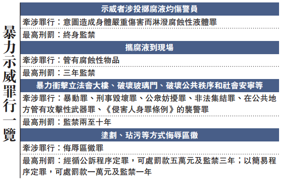 大律师马恩国任主席的香港法学交流基金会发声明指出,示威者向警察投掷腐液,除灼伤13名警员,也可能导致大量人命伤亡,已涉触犯“意图造成身体严重伤害而淋泼腐蚀性液体罪”,最高可判处终身监禁。另外,示威者暴力冲击立法会大楼,可能干犯《公安条例》多项控罪,其中情节较严重的“暴动罪”可被判十年监。