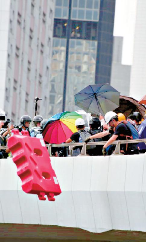 反对派激进示威者已到丧心病狂的阶段,除不断以铁马冲击警方防线,有人向在场警务人员投掷载有不知名液体水弹、冒烟的不知名物体等,造成多名警员呼吸困难及皮肤红肿;又有示威者将整个水马由天桥扔向警方。消防处证实,下午在立法会现场发现的粉末为第四类危险品苯二胺,如大量吸入,可引致皮肤及呼吸道严重烧伤。