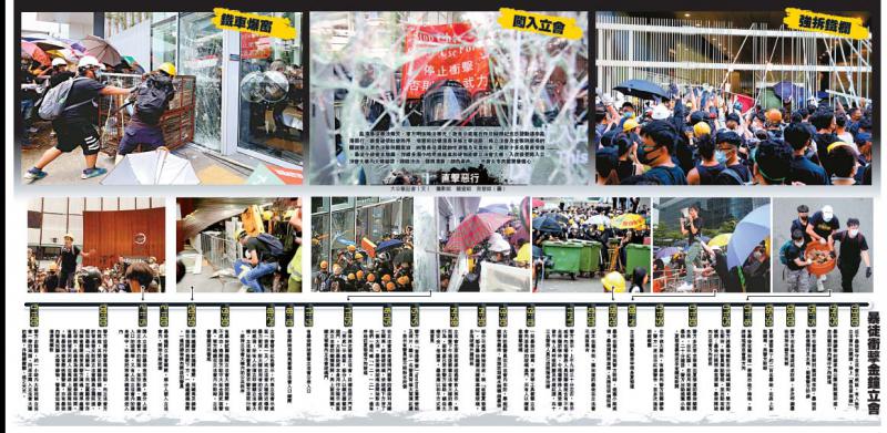 昨日上午,示威者开始冲击警方防线,有示威者向警员投掷装有不明液体的容器,13名警员被溅伤送院。下午起,暴徒用铁笼车、绑在一起的铁马阵、粗铁管、铁支、雨伞等,撞击立法会大楼在添美道一侧的玻璃幕墙,多块玻璃裂开,有玻璃被撞出大洞。之后有暴徒向在立法会内戒备的警员洒有毒粉末“苯二胺”,有警员半边身出现大面积发红。亦有暴徒以激光照射警员眼睛。
