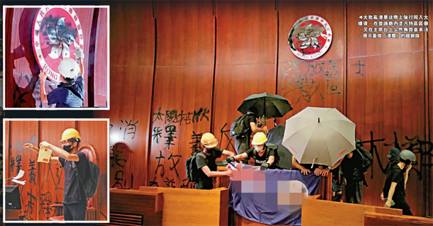 图:大批乱港暴徒晚上强行闯入大楼后,在会议厅内涂污特区区徽,又在主席台上公然撕毁基本法,展示象征“港独”的龙狮旗