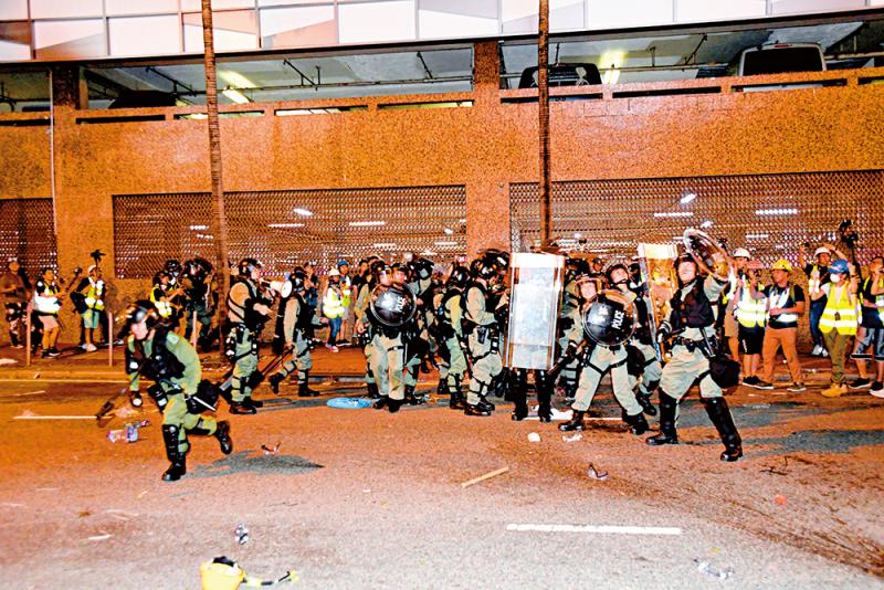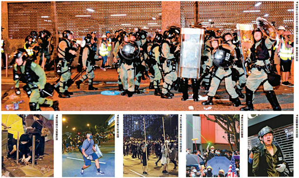 乱港分子昨日又在沙田使出“先游行,后占领”的阴招,多番暴力施袭随时杀警,触目惊心!夜晚警方清场时,有暴徒在好运中心、沙田中心平台,从高空向地面的警员掟转头、雨伞、水樽等杂物。亦有暴徒在沙田新城市广场“打游击战”,疯狂袭击落单的警察,穷凶极恶地用木棍、雨伞围殴警员,以及脚踢头部,至少11名警员受伤,10人送院。新界南重案组警长无名指骨折,血溅当场,亦有警员手指被搞事者咬断,更有警员被硬物击中倒地昏迷。政府发言人强烈谴责搞事者暴力袭击警察,社会绝不容忍。社会各界纷纷强烈谴责暴徒无休止的暴力行为,促请政府和警方捍卫法治。\大公报记者 冼国强(文) 摄影组 调查组(图)