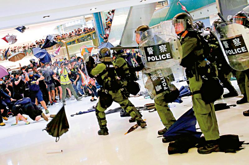 图:警员在新城市广场内被围攻,不停有雨伞、杂物从四面及高处掷向警员\路透社