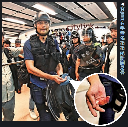 混乱中,新界南重案组警长右手无名指头断开见骨,血肉模糊,更有警员右后脑受伤流血,需要由两名同袍搀扶离开。商场中庭留有血迹。警方表示,有11名警员受伤,其中一名被咬断手指,另一名被钳夹断手指。