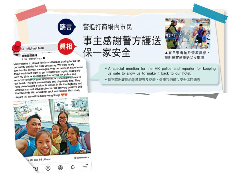 【大公报讯】14日沙田暴动中,新城市广场爆发激烈冲突,大批暴徒从高空投掷杂物,吓得现场的市民四散奔逃,一名爸爸带着三个女儿,在一名防暴警察的掩护下急步离开,却被乱港派造谣,包括“港独”组织“光复最前线”、“本土民主前线”、“沙田重点项目计划关注组”等,都贴文称警察“追打”市民,“细路都唔放过”云云。有关谣言在网上愈传愈离谱,甚至被改图为“尸杀商场”,企图引起市民对警察的不满情绪。