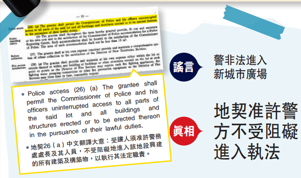 翻查新城市广场的地契,条款清楚列明,警务处处长及其人员可不受阻碍地进出(Uninterupted access),并可在地契范围内执行法定职务(in the pursuance of their lawful duties)。