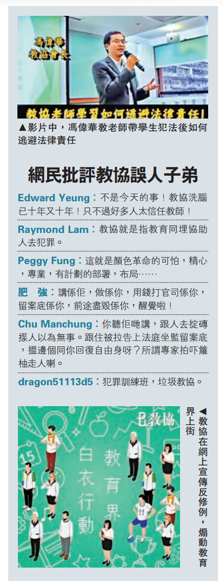 教评会主席何汉权表示,教育是比法律更高层次,但教协却教老师走法律罅,明显是不道德。他批评,教协长期骑劫教育界,更曾多次煽动老师学生罢课,由2014年至今,加上近年多宗暴力事件,教胁从未有向暴力说不,败坏了教界的专业形象,更影响老师、学生价值观。