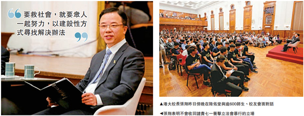 香港大学校长张翔昨日傍晚在港大陆佑堂与学生会面对话,逾600师生、校友参与。张翔表明不会收回谴责七一冲击立法会暴行的立场,是因为他恐惧暴力,担心会酿成悲剧,“这不只是打烂了玻璃或窗口,而是会引发很大的危险,过去两周的确已发生了流血事件,大家都不想见到流血。”他坦言担心学生的安危,港大会保障和帮助学生,亦希望学生互相帮助,亦呼吁政府要听民意、市民要愿意对话。\大公报记者 朱乐怡 朱俊贤(文) 黄洋港(图)
