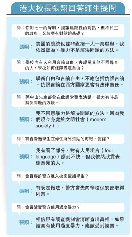 张翔当晚已即步出寓所、接过“大声公”与学生对话,昨日,他再出席港大陆佑堂举行的对谈会,历时一个半小时,14名学生、校友被抽中发问,张翔逐一回应。张翔形容昨晚是港大,甚至香港在过去一个月来,首次有机会以对话讨论事件,希望可帮助香港社会,甚至政府聆听不同意见。他表明,自己至今仍然反对一切暴力,“我一生中见过很多激烈冲突,知道一些事情发生了,便没有返转的余地”。