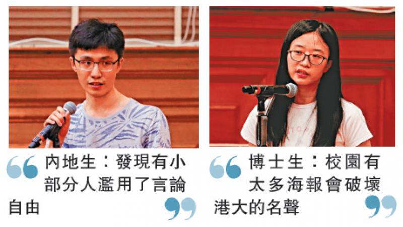 来自内地的博士生发问提到,当初选择来港大读书因为其国际声誉好,但这两个月发生的事件,感到大学过于涉及政治,认为校园有太多海报会破坏港大的名声,问张翔会否收紧贴海报的规定;亦有学生问他如何看有张贴标语被内地学生或其他人撕走。亦有男内地学生表示,希望香港有好的未来,亦支持言论自由,但发现有小部分人滥用言论自由,人身攻击持不同意见的人,问张翔如何保护不同意见的学生。